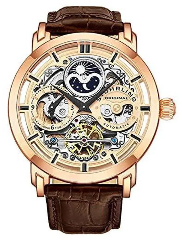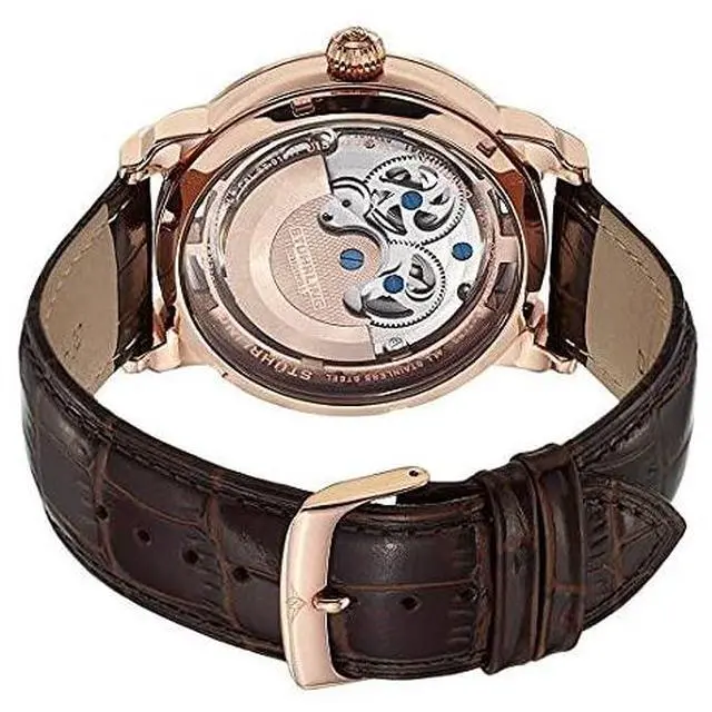 Rose (Open Heart) dial enhanced by black dauphine-style hands. Rose Gold-tone stainless steel case with a brown leather band. Automatic movement. 50 meters / 165 feet water resistance. Fixed bezel. Scratch Resistant Mineral crystal. Transparent caseback. Tang clasp. Pull / Push crown. Case size 47 mm x 15.14 mm. Stuhrling Original M13522 Legacy Watch.