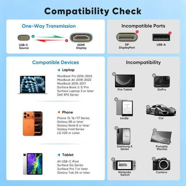 No. Your device must support DisplayPort Alt Mode over USB-C port or use a Thunderbolt 3/4/5 port. It won’t work with USB-C ports that only support charging or data.