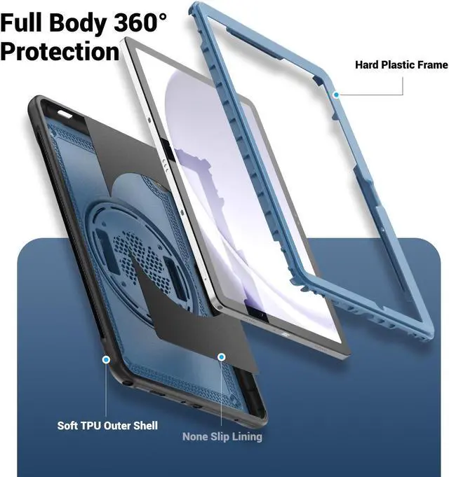 The rugged case is made from polycarbonate and anti-skidding soft TPU, multi-layer protection from the inner shell, outer slipcover, built-in screen protector, keeping our expensive tablets from being damaged by accidentally drops, scratches, shocks.