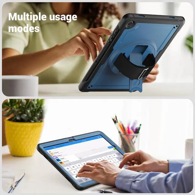 The stand is something we can't live without, we need it to support the tablet so that we can watch or type. This sturdy case offers a 360° rotatable foldable stand that supports our tablet both vertically and horizontally, allowing us to always use it at a comfortable angle.