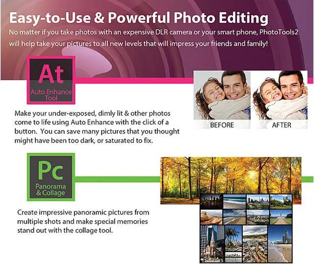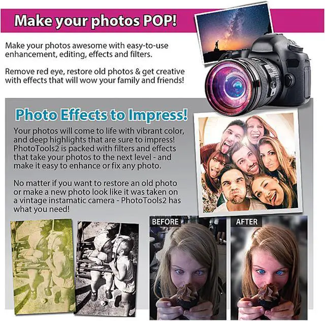 Introducing the new Phototools! It’s sophisticated editing tools will help you achieve the best editing results for your photos with the click of a few buttons. From re-touching to organizing, Phototools gives even then budding photographer the tools to edit and enhance photos with the power of a professional. Phototools 2 helps your find your images and to achieve professional, clean editing results, and create artistic and interesting photos with over 100 filters, special effects, and powerful adjustment and repair tools.