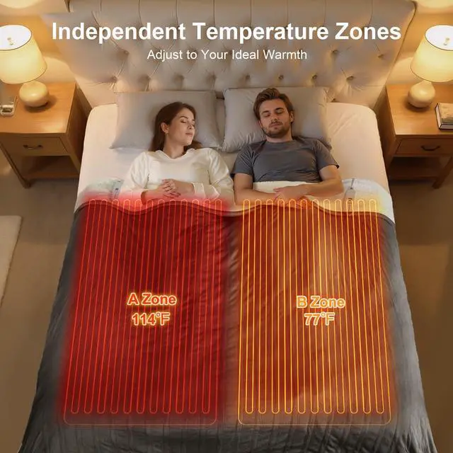 The independent heating zones allow couples to set different temperatures on each side, so everyone enjoys personalized comfort. A 10-hour auto shut-off ensures steady warmth throughout the night, while built-in overheat protection delivers reliable use.