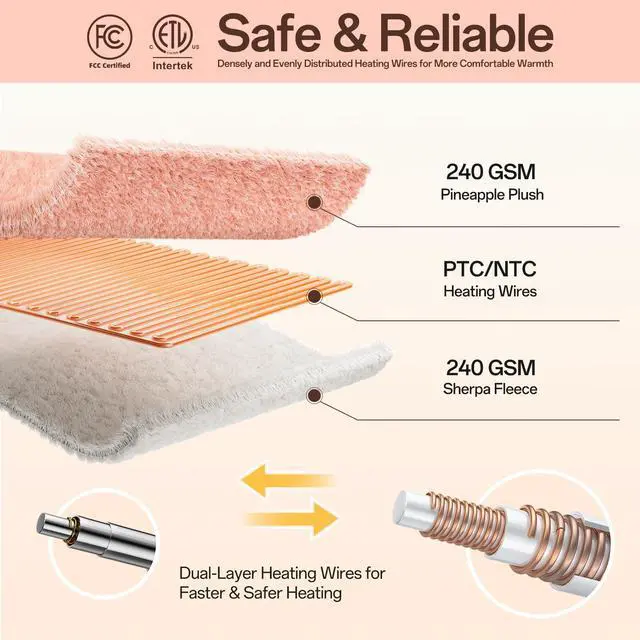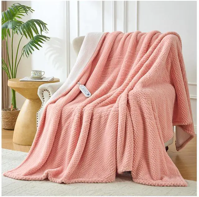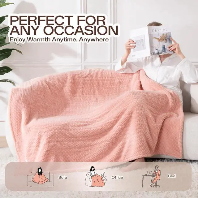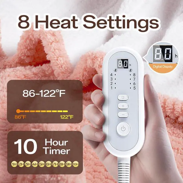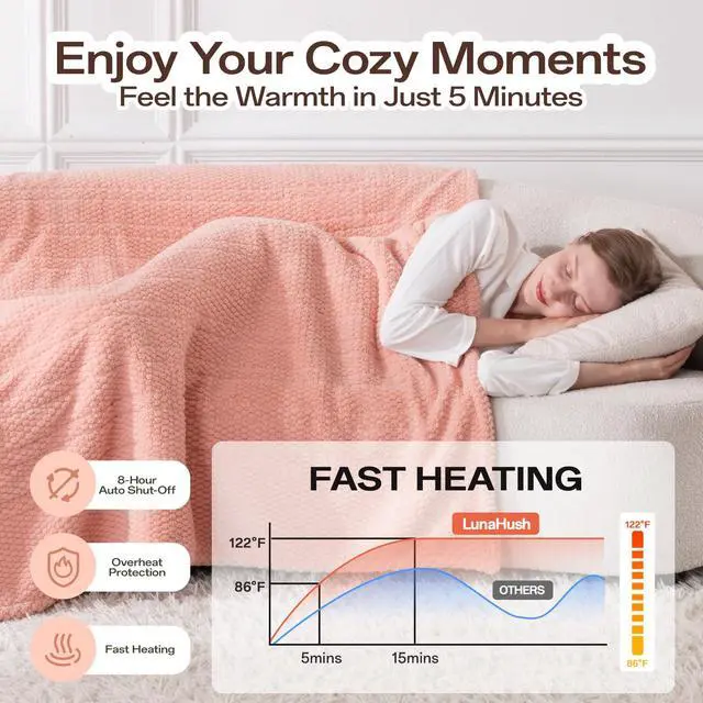 Reminder: We recommend spending 35 minutes carefully reading the electric blanket user manual before use. This will help you get the best experience with your LunaHush heated blanket. Warm Material: The A-side of the LunaHush electric heated blanket is made of ultra-smooth, skin-friendly pineapple plush, while the B-side uses cozy shaper fleece fabric. Perfect for autumn and winter naps, reading, watching TV, working from home, or campingbringing you lasting warmth and comfort. Multiple Colors & Patterns: Available in 3 colors/patternsgreen, pink, grey. The 3D Pineapple Jacquard is created with a special process that never fades. Each heating blanket is durable, lint-free, and fade-resistant. Whether its the green, pink, grey, every design is stylish, functional, and decorativeadding warmth to you and beauty to your home. Please note: The colors of washable heated blanket may appear different under various lighting and viewing angles. A Warm Gift: Ideal for Christmas, birthdays, Mothers Day, Fathers Day, Thanksgiving, and more. A thoughtful gift for grandparents, parents, partners, daughters, friends, or elders. Available in sizes 50"×60", 62"×84", 72"×84",84"×90",and 90"×100". Functions: Comes with a digital remote control featuring 8 heat levels (86°F122°F), rapid heating in 35 minutes, and a 110 hour timer with automatic shut-offkeeping you and your family warm all winter. How to Use: Connect the controller to the heated throw blanket electric securely, then plug into a power outlet. Press the power button on the remote to turn on; press again to turn off. Use the temperature button to adjust heat and the timer button to set your desired duration. Safe & Reliable: ETL & FCC certified, equipped with PTC/NTC heating wires and overheat protection, ensuring a safer user experience. Care Instructions: Before washing: Disconnect power and controller. Do not dry clean or use bleach; cleaning solvents may damage insulation. Machine wash: Never immerse the power cord or controller in water. Place only the fabric portion in the washer on gentle or slow cycle. Hand wash: Disconnect all cords. Place the soft cozy heating blanket in warm water (below 100°F) with mild detergent. Soak for 5 minutes, then gently press and release for another 5 minutes. Do not wring, twist, or scrub. Rinse thoroughly with cold water, press out excess water by hand, and air dry. Drying: Do not use commercial dryersthey may overheat and damage fabric. Do not iron. Ensure the electric blanket is completely dry before reconnecting power. Tumble dry: Use low heat until fully dry. Ensure ample space for the fabric to tumble freely. If slight shrinkage occurs after washing, gently stretch back to original size. Air dry: Hang on two parallel clotheslines or rods, securing both ends. Do not use clothespins that may snag wires. Storage: Fold and store in a dry place, just like other soft warm blankets. Intended Users: Suitable for adults only. Not recommended for infants, individuals with disabilities, those insensitive to heat, or anyone unable to operate the controller properly.