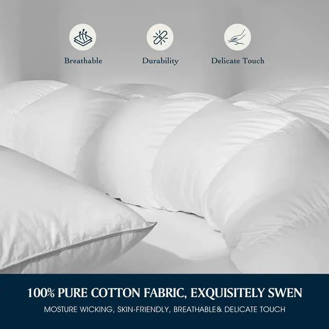 This Serta white goose feather and down fiber comforter is the perfect solution for warmth and comfort. The unique fill gives you the look and feel of an all down filled comforter for a fraction of the cost. The all-season warmth fill weight is perfect for almost climate. Youll love the look and feel of the 233-thread count, breathable 100% cotton cover. The end to end sewn through box quilting ensures that the white goose fiber doesnt shift, so youll never have any cold spots on the bed.