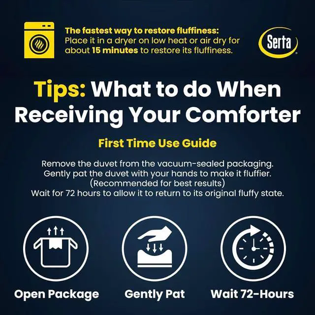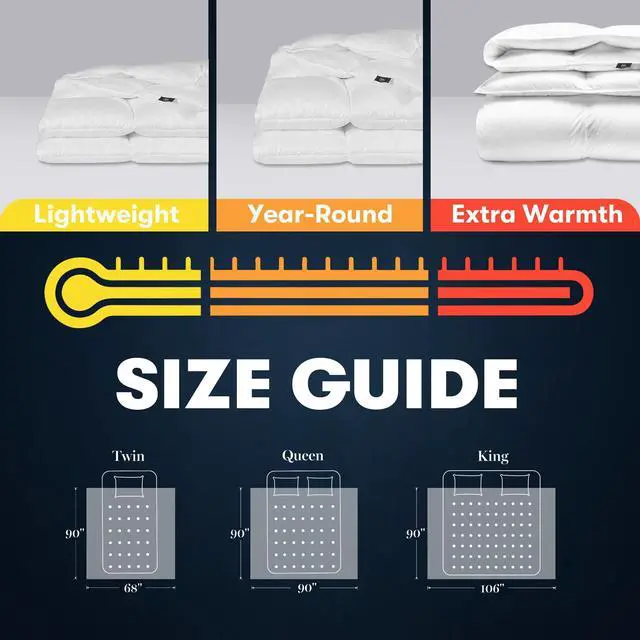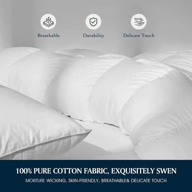This Serta white goose feather and down fiber comforter is the perfect solution for warmth and comfort. The unique fill gives you the look and feel of an all down filled comforter for a fraction of the cost. The all-season warmth fill weight is perfect for almost climate. Youll love the look and feel of the 233-thread count, breathable 100% cotton cover. The end to end sewn through box quilting ensures that the white goose fiber doesnt shift, so youll never have any cold spots on the bed.
