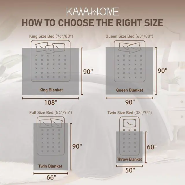 KAWAHOME Sherpa Blanket is Thick and Extra Warm: Deeper sleep No harm to skin Lock warmth Excellent Quality KAWAHOME attaches great importance to product quality. One side of fleece blanket looks smooth and the other touches cozy and fluffy. Good stitching at seamsthreads will not fall apart. High-end Woven Label KAWAHOME focuses on every detail. We choose high-end woven labels instead of printed labels to make KAWHOME Sherpa Blanket a perfect gift for EasterMother's Day, Father's Day, Birthday, HalloweenThanksgiving and Christmas. Focus on User Experience KAWAHOME cares about the health of you and your family. KAWAHOME 500gsm Sherpa Blanket is soft, fuzzy and skin-friendly, will not cause any harm to your skinlock warmth in cold night. Double Layer Design, Reactive Printing, 4 Size Available King size and Queen size in stock Bright colors Elegant look