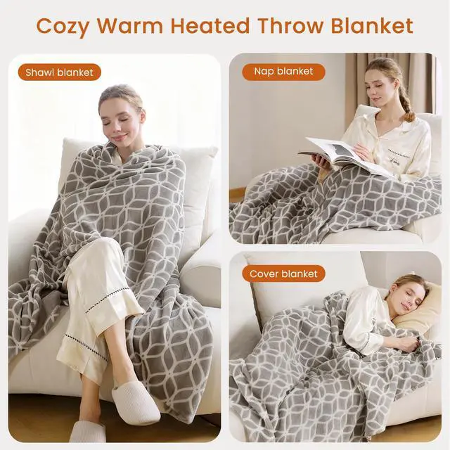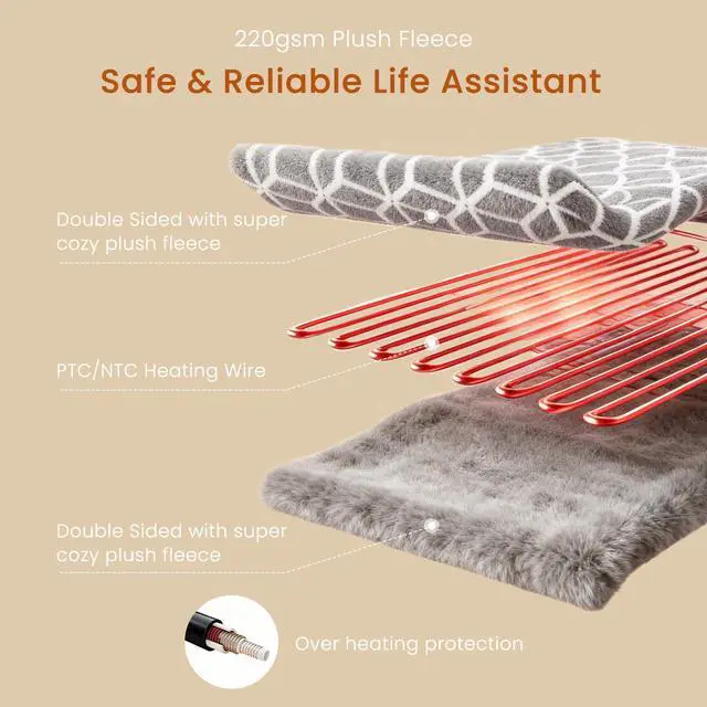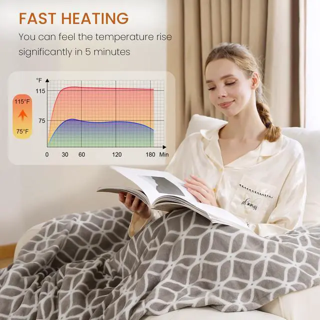 Cozy Warmth & Customisable Comfort Our heated throw blanket is crafted from comfort ultra-soft premium flannel and sherpa fleece, providing a cozy and comfortable sleeping experience. Powered by advanced heating wire technology, it can precisely control the temperature to ensure safe warmth, and fast heating within 5 mins. With 4 heating levels (90-110°F), you have complete temperature control.
