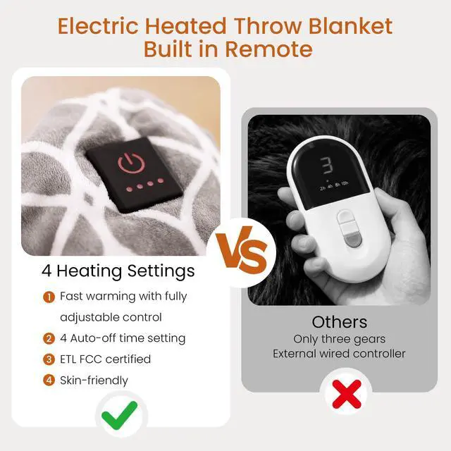 Easy Operation & Safe AssuredThe electric blanket is ETL certified and features NTC overheat protection technology with a 4-hour auto power-off time. The cozy warm heated blanket equipped with a built-in remote for convenient one-touch operation, no need to search for a controller, no worry about losing Perfect for cozying up during colder months.Our heating blanket has a 15-foot power cord, twice as long as the regular model, so you can move around freely.