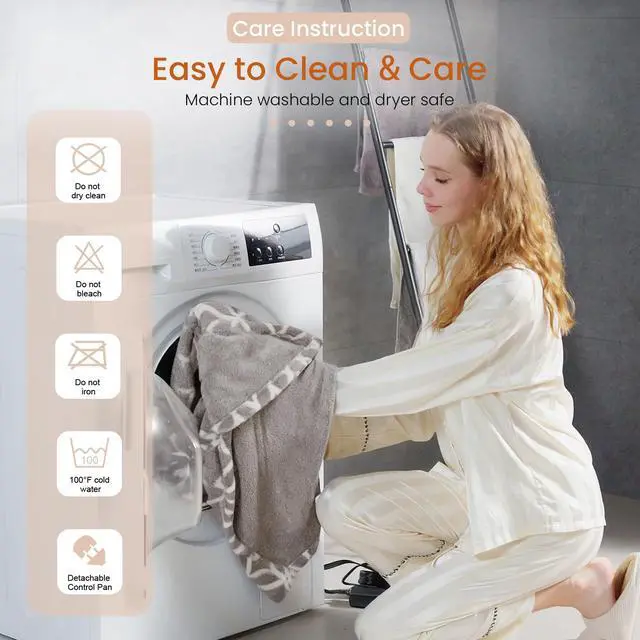 Machine Washable & Easy to MaintainFor your convenience, our heated blanket throw is machine washable. It can be machine washed in cold water, tumble dry at low heat. we recommend air-drying or low-temperature drying. Do not iron, bleach or dry clean. Remove the controller and cool it down before cleaning. Please note: Read the user manual for complete care instructions.