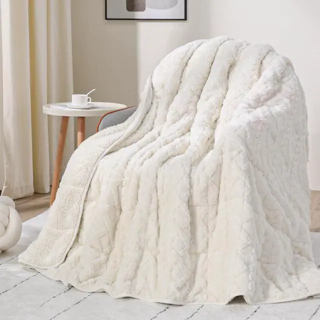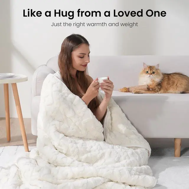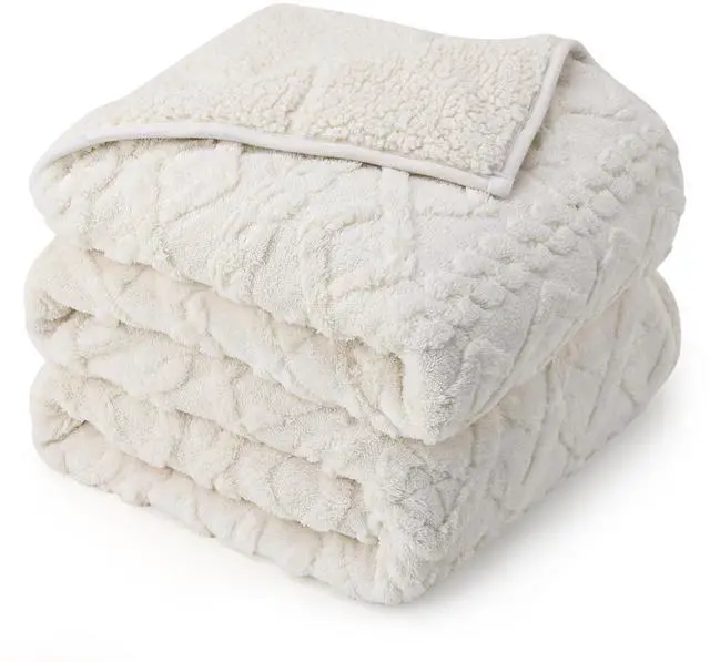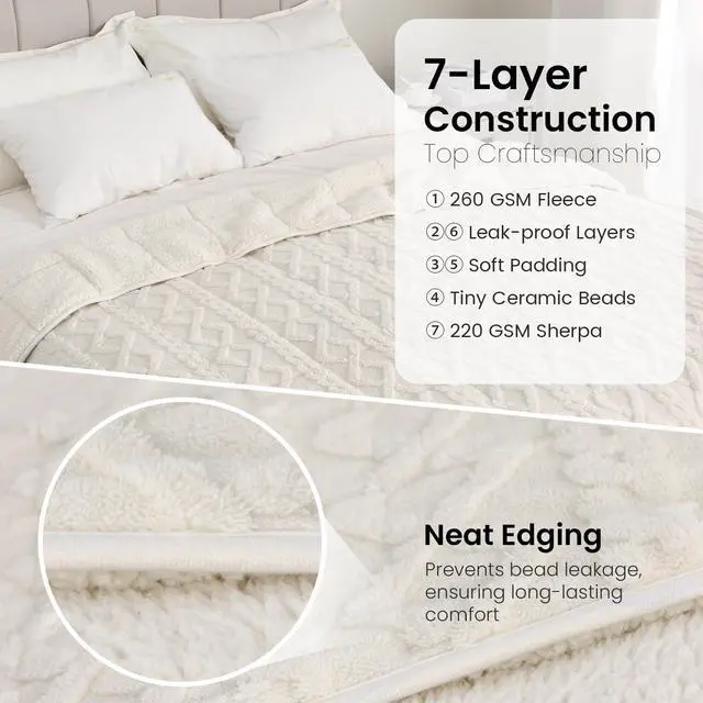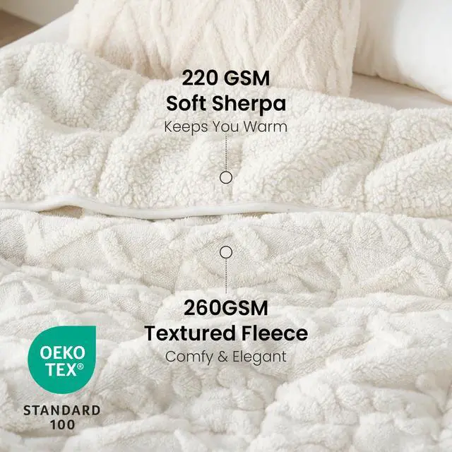 Weighted Blanket 15lbs Queen Size, Soft and Thick Jacquard Sherpa Heavy Blanket for Calming and Relax, Dual Sided Ultra Soft Fuzzy Throw Blanket with Ceramic Beads, 60 x 80 inches, Cream White