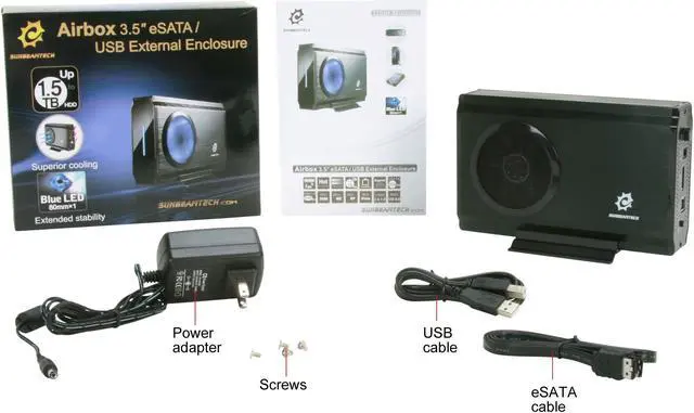 • neweggCompatible with 3.5” Hard DriveThe SunbeamTech Airbox En-AIR-ES3-BK enclosure is compatible with 3.5-inch SATA I/II hard drives for a maximum storage capacity of up to 1.5TB, providing an ideal solution for your portable storage needs.