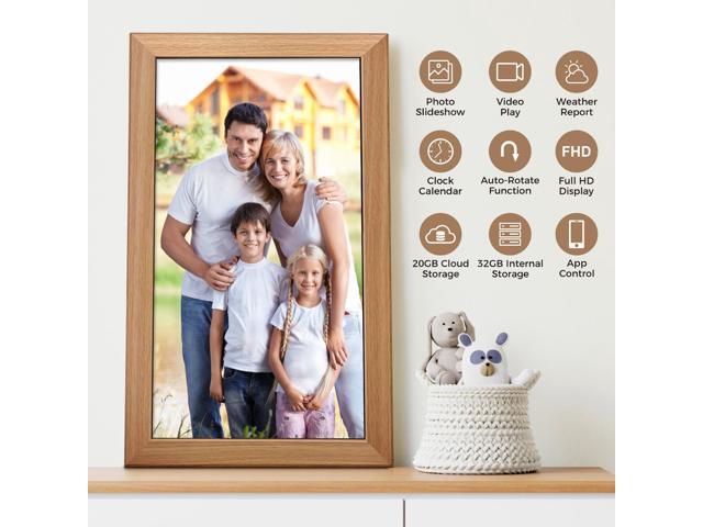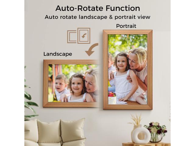 - 4. AUTO-ROTATE & LARGE INTERNAL STORAGE: Automatically rotate photos to adjust orientation, which allows you to place the cloud frame in either portrait or landscape mode. Built-in 32GB memory empowers a huge capability of storage. It also supports SD cards up to128GB.