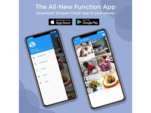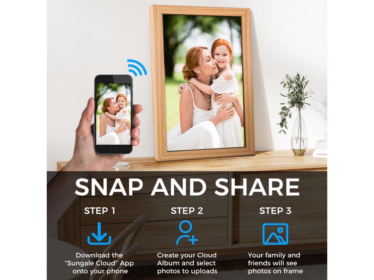 - 2. CREATE YOUR PERSONAL CLOUD ALBUMS & EASY SHARE: Create your Personal Cloud Album and send Photos from your phone to frame with the Sungale Cloud app (iOS and Android) , Share photos to with loved ones' frames and invite others to share photos to your frame.
