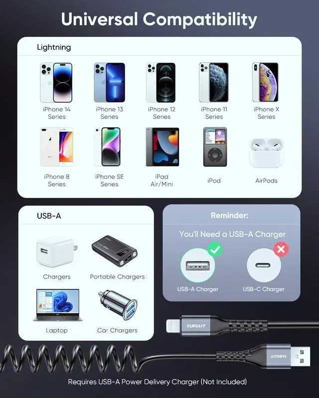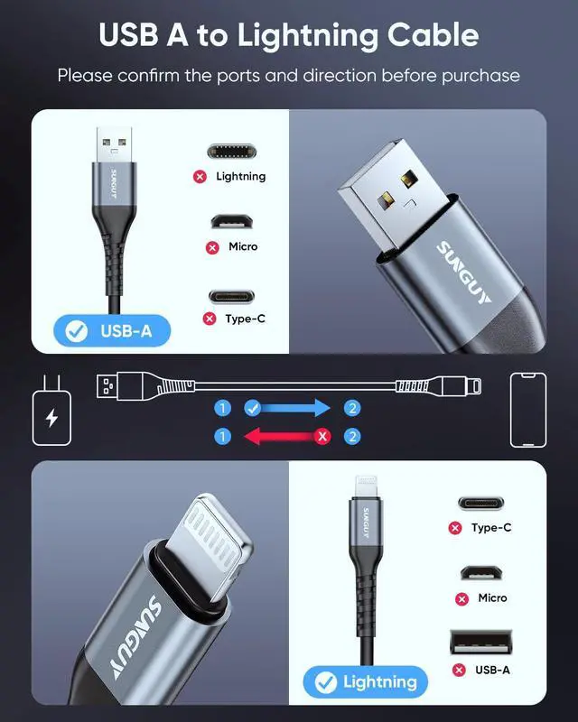 What You GetYou'll receive 2 coiled USB-A to Lightning cables, backed by a 12-month warranty. If you have any questions, feel free to contact us via Amazon Messages or reach out to SUNGUY Customer Support directly.