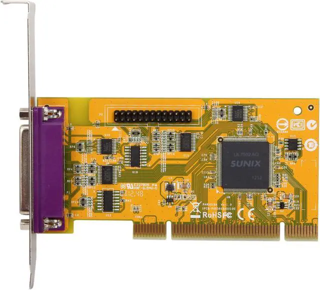 | Specifications | General -Interface: IEEE1284 -Controller: SUNIX UL7502AQ -BUS: Universal PCI 64/32bit 3.3V/5V PCI Ver 3.0, 2.3, 2.2, 2.1 -IRQ & IO: Assigned by System Parallel Communication -Interface: IEEE1284 -No. of Port : 2-port -FIFO: 16byte Hardware -Mode: SPP / ECP / EPP / BPP -Speed: Maximum 1.8MBps -PCB Connector: DB25 Female & 13 x 2 Pin Header Driver Support -Windows Client XP/Vista/7/8/8.1 (X86/X64) -Windows Server 2000 / 2003 / 2008 / 2008 R2 / 2012 / 2012 R2 (X86/X64) -Windows Embedded Windows CE 4.2/5.0/6.0 XP Embedded / POSReady 2009 / POSReady 7 / Embedded System -Linux: Linux 2.4.x/2.6.x/3.x -DOS: DOS Regulatory Approvals -Hardware: CE EN55022 Class B, EN55024, EN61000-3-2, EN61000-3-3, VCCI Class B FCC Part 15 Class B, BSMI: CNS13438, C-Tick: CISPR22 AS/NZS, RoHS -Software Microsoft WHQL Windows: Windows Client: XP/Vista/7/8/8.1 (X86/X64) Windows Server: 2000/2003/2008/2008 R2/2012/2012 R2 (X86/X64) |
