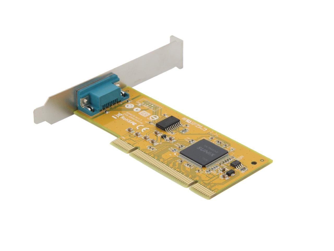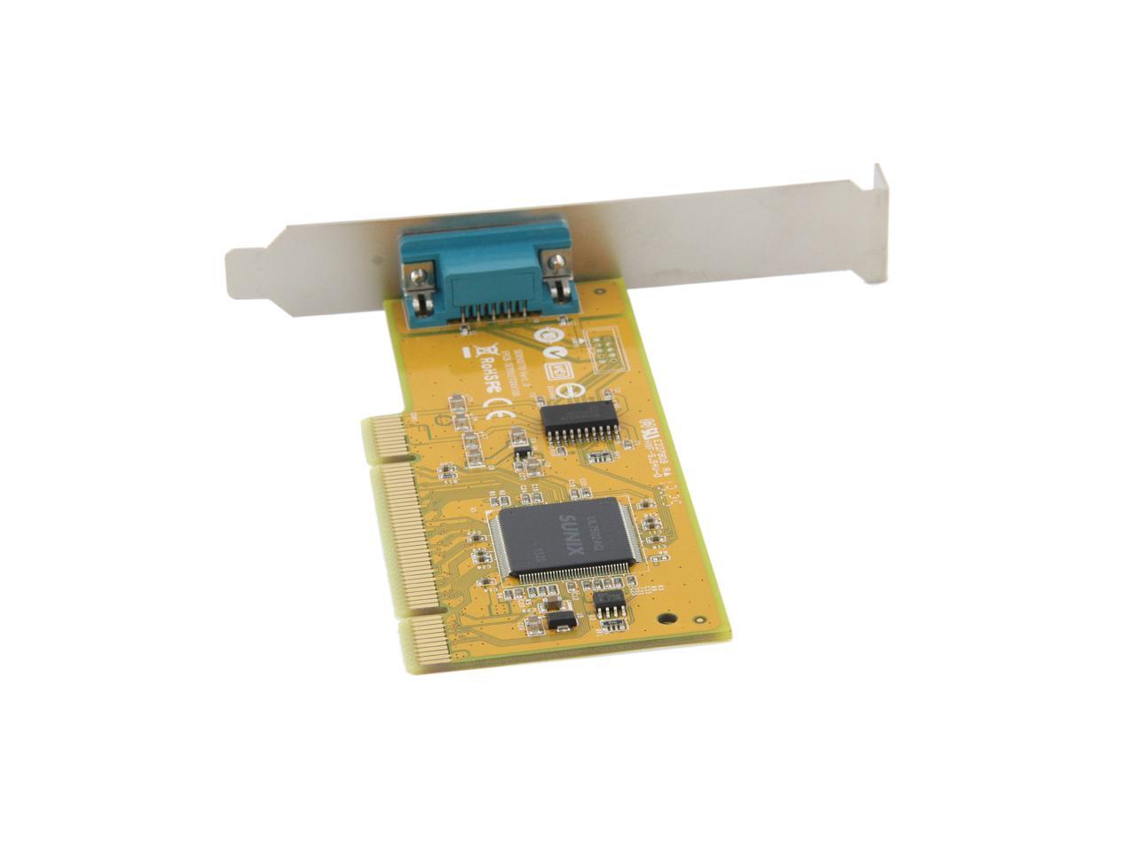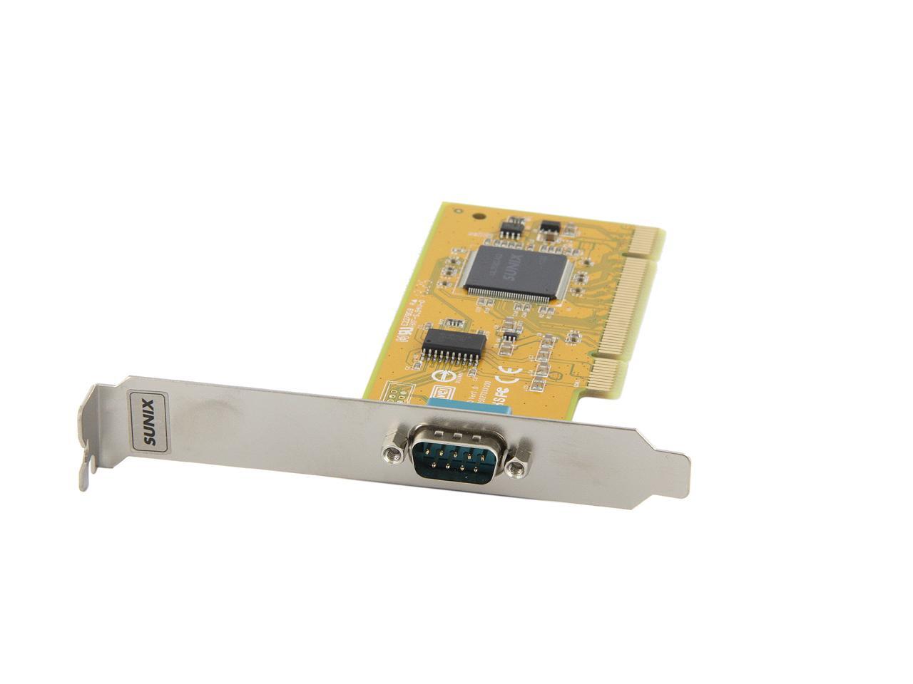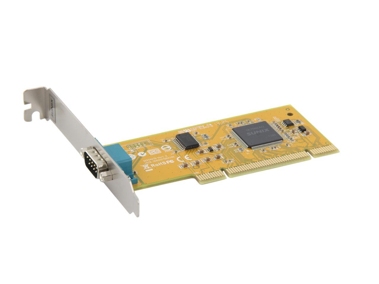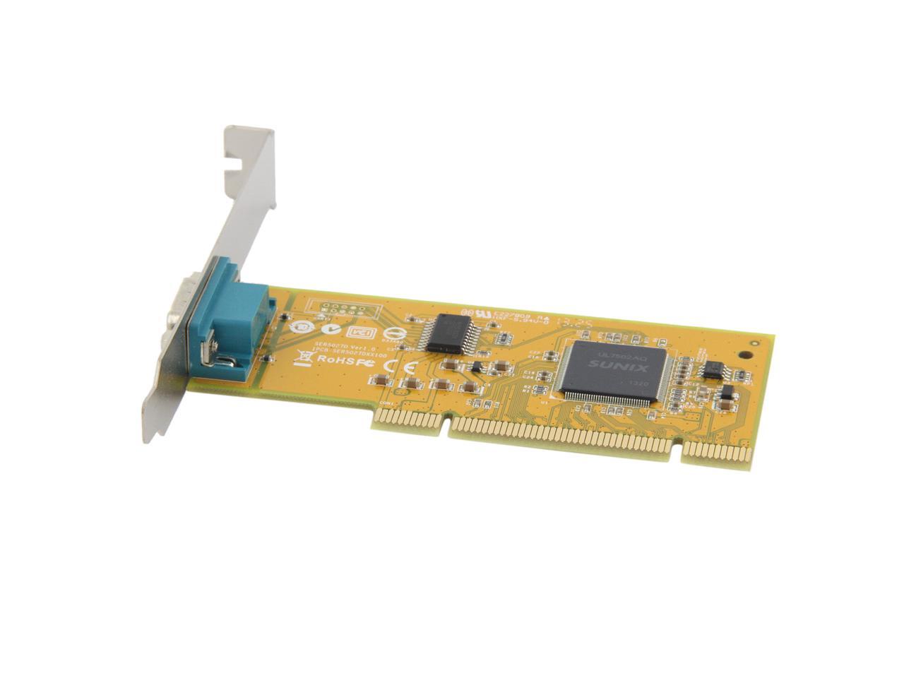 | Specifications | Serial Communication -Interface: RS-232 -Controller: SUNIX UL7512EQ (16C650 UART Compatible) -BUS: Universal PCI 64/32bit 3.3V/5V PCI Ver 3.0, 2.3, 2.2, 2.1 -No. of Port: 1port -IRQ & IO: Assigned by System -FIFO: 32byte Hardware -Signal: DCD, TxD, RxD, RTS, CTS, DTR, DSR, GND, RI -Baud rate: 50bps ~115.2Kbps -Stop bit: 1, 1.5, 2 -Parity: even, odd, none, mark, space -Flow Control: None, Xon/Xoff, RTS/CTS -Protection: +/-2KV ESD protection for each signal Human Body Model (HBM) -PCB Connector: DB9 Male Driver Support -Windows Client: XP/Vista/7/8/8.1 (X86/X64) -Windows Server: 2000 / 2003 / 2008 / 2008 R2 / 2012 / 2012 R2 (X86/X64) -Windows Embedded: Windows CE 4.2/5.0/6.0 XP Embedded / POSReady 2009 / POSReady 7 / Embedded System -Linux: Linux 2.4.x / 2.6.x -DOS: DOS *FreeBSD: FreeBSD 5.3~5.5 / 6.0~6.4 *QNX: QNX 6.3.2 / 6.4.0 *IBM OS/2: WARP 3 / WARP 4 *SCO UnixWare: UnixWare 7.1.3 /7.1.4 / Open Server 5.0.7 / 6.0 *Sun Microsystems: Solaris 10 Regulatory Approvals -Hardware CE EN55022 Class B, EN55024, EN61000-3-2, EN61000-3-3, VCCI Class B FCC Part 15 Class B, BSMI: CNS13438, C-Tick: CISPR22 AS/NZS, RoHS -Software Microsoft WHQL Windows: Windows Client: XP/Vista/7/8/8.1 (X86/X64) Windows Server: 2000/2003/2008/2008 R2/2012/2012 R2 (X86/X64) |