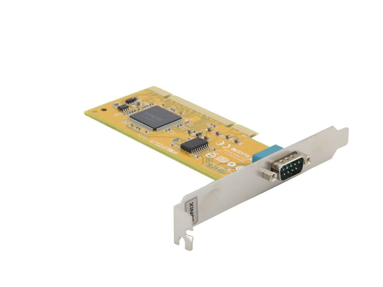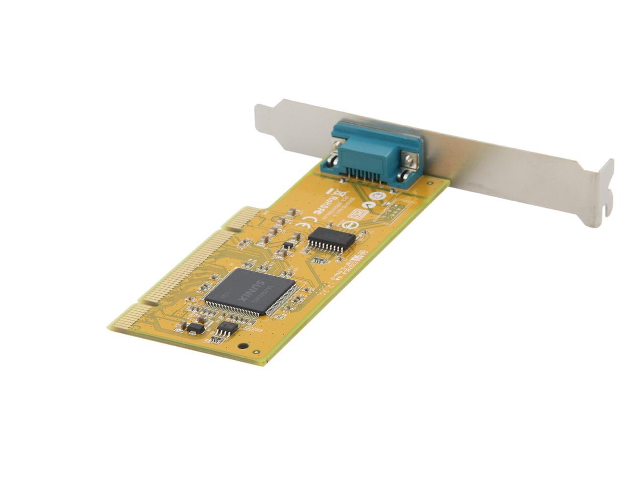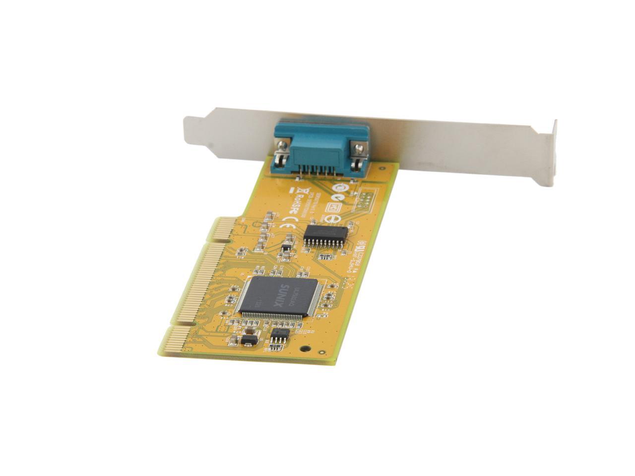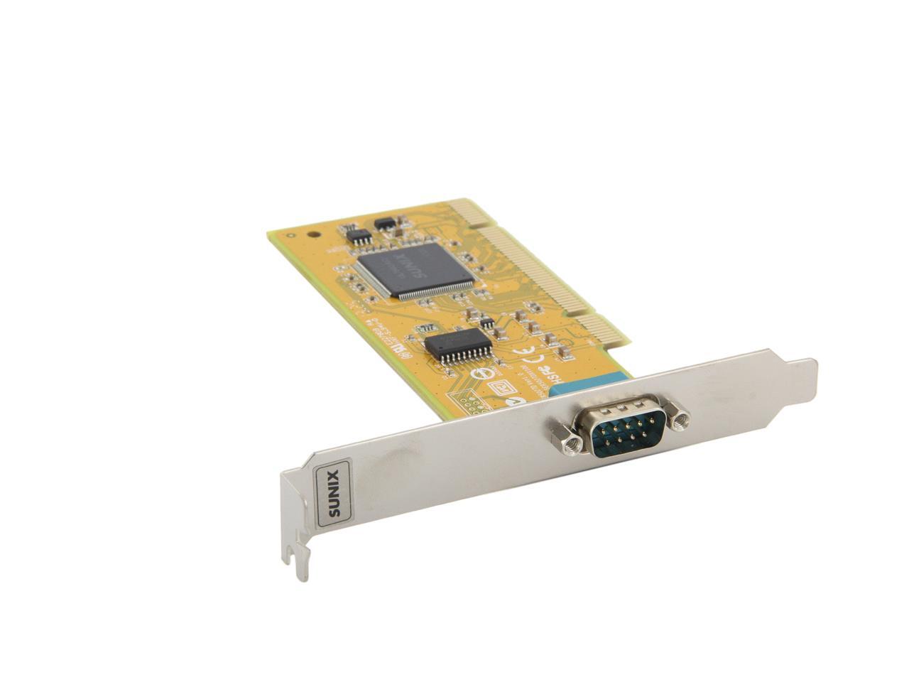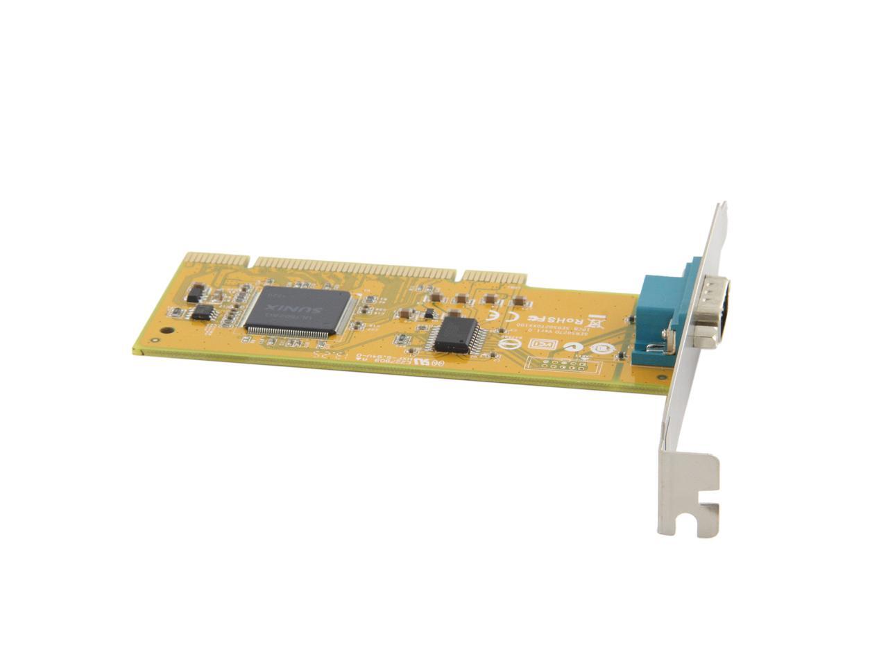 | Specifications | Serial Communication -Interface: RS-232 -Controller: SUNIX UL7512EQ (16C650 UART Compatible) -BUS: Universal PCI 64/32bit 3.3V/5V PCI Ver 3.0, 2.3, 2.2, 2.1 -No. of Port: 1port -IRQ & IO: Assigned by System -FIFO: 32byte Hardware -Signal: DCD, TxD, RxD, RTS, CTS, DTR, DSR, GND, RI -Baud rate: 50bps ~115.2Kbps -Stop bit: 1, 1.5, 2 -Parity: even, odd, none, mark, space -Flow Control: None, Xon/Xoff, RTS/CTS -Protection: +/-2KV ESD protection for each signal Human Body Model (HBM) -PCB Connector: DB9 Male Driver Support -Windows Client: XP/Vista/7/8/8.1 (X86/X64) -Windows Server: 2000 / 2003 / 2008 / 2008 R2 / 2012 / 2012 R2 (X86/X64) -Windows Embedded: Windows CE 4.2/5.0/6.0 XP Embedded / POSReady 2009 / POSReady 7 / Embedded System -Linux: Linux 2.4.x / 2.6.x -DOS: DOS *FreeBSD: FreeBSD 5.3~5.5 / 6.0~6.4 *QNX: QNX 6.3.2 / 6.4.0 *IBM OS/2: WARP 3 / WARP 4 *SCO UnixWare: UnixWare 7.1.3 /7.1.4 / Open Server 5.0.7 / 6.0 *Sun Microsystems: Solaris 10 Regulatory Approvals -Hardware CE EN55022 Class B, EN55024, EN61000-3-2, EN61000-3-3, VCCI Class B FCC Part 15 Class B, BSMI: CNS13438, C-Tick: CISPR22 AS/NZS, RoHS -Software Microsoft WHQL Windows: Windows Client: XP/Vista/7/8/8.1 (X86/X64) Windows Server: 2000/2003/2008/2008 R2/2012/2012 R2 (X86/X64) |
