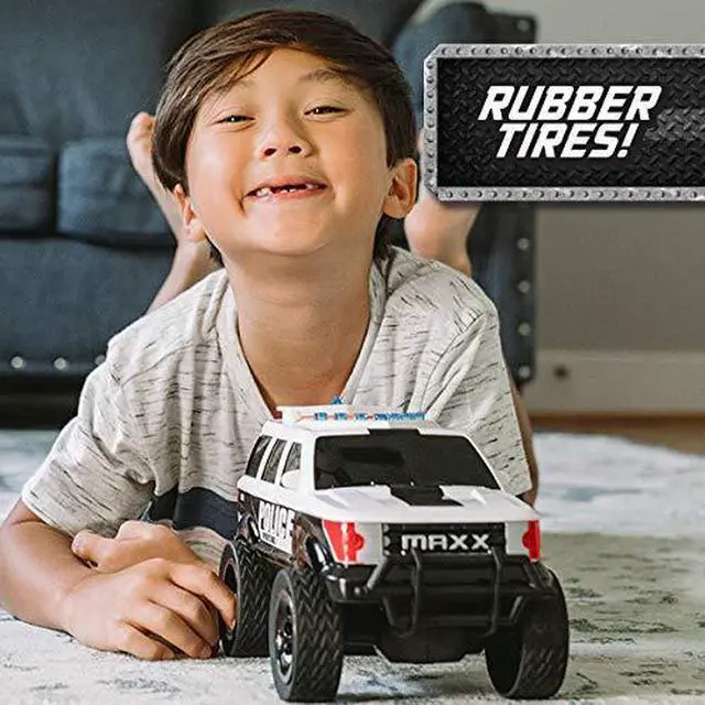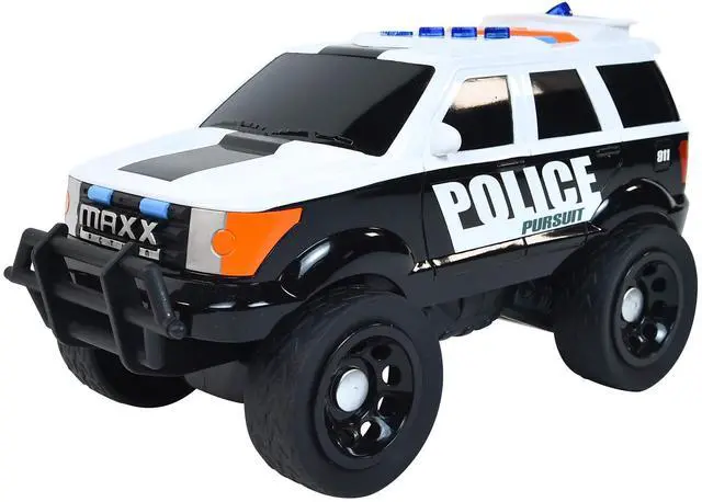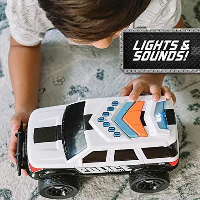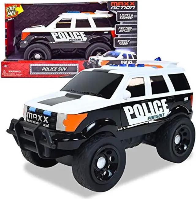 Young police officers can respond to pretend missions with the Maxx Action Police SUV. Measuring almost 12 inches long, this rescue vehicle can take on any task imaginable. The bright LED lights will light up any room while the automotive sound effects and realistic sirens make for exciting and engaging playtime. Equipped with a motorized engine, take off at high speeds with the push of a button. Soft super grip tires allow for a long and smooth ride to any pretend emergency. With authentic details and the ultra-realistic features, kids will have hours of exciting imaginative play.
