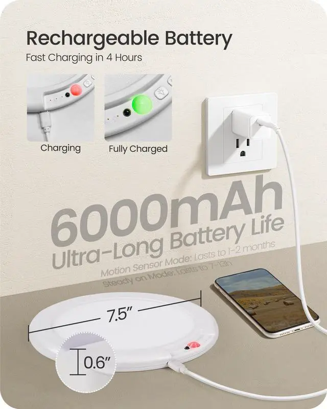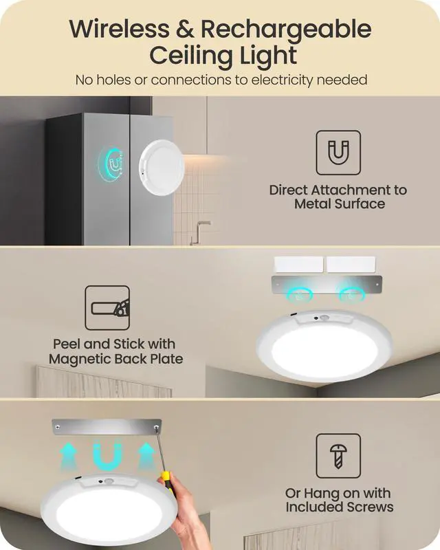 The rechargeable ceiling light saves money on batteries. Magnetic design, simply remove to charge, no need to peel adhesive, charging made easier!
