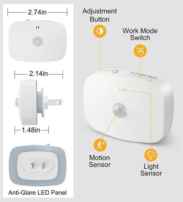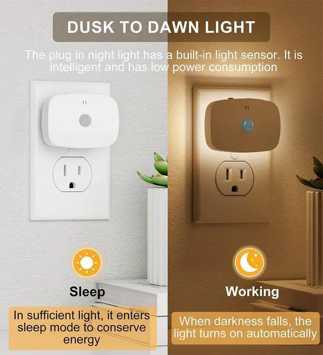 NIGHT MODE: The plug in night light also has a built-in light sensor. In this mode, the dusk to dawn function will be activated and the light status will be determined by the surrounding light. The night light will automatically turn on at night and turn off at dawn or when there is enough light. No manual operation is required. This mode is not affected by the motion sensor.