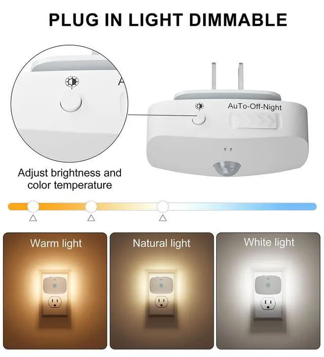 MULTI-FUNCTION ADJUSTABILITY: This LED night light supports 3 color temperature settings (3000K warm light, 4500K natural light, and 6000K white light). Press and hold the button to adjust the brightness from 10-100% to meet your different brightness needs. The memory setting can be saved without turning off the power, so there is no need to reset it.