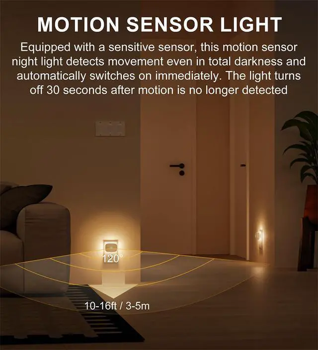 AUTO SMART MODE: This smart night light has a built-in high-sensitivity motion sensor with a detection range of up to 15 ft and a coverage angle of up to 120°. When motion is detected in a dark environment, this motion-sensing night light will automatically turn on, and if no motion is detected within 30 seconds, it will automatically turn off to save energy.
