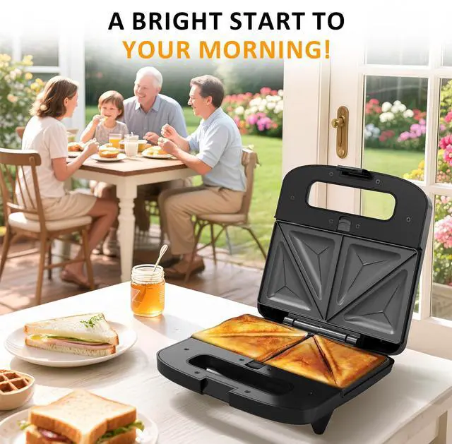 | Bullet Point | 3 in 1 Functionality: This 3-in-1 waffle iron makes your breakfast prep a breeze. From sandwiches to waffles to grilled meat, it does it all, saving you space and time in the kitchen. Enjoy endless culinary possibilities with this compact and efficient appliance., Cool-Touch Handle & Indicator Lights: Boasting a cool-touch locking handle for safe food handling and an indicator light to simplify the cooking process, the red light indicates machine operation while turning green upon heating completion, ensuring perfectly cooked sandwiches., Easy to Clean: Our non-stick coating plates make cleanup a breeze. Just wipe it with a cloth or toss it in the dishwasher for your next meal. And for the exterior shell, a simple wipe does the trick for cleanliness., Fast Heating: With 800W of power, our waffle maker swiftly crafts sandwiches, omelets, French toast, and more, delivering delicious breakfast options in minutes. Even the busiest individuals can savor a delightful breakfast and kick-start a happy day., Versatile Use: Compact and lightweight, this sandwich maker easily fits in tight spaces and is portable for travel, camping, or outdoor activities, ensuring delicious meals on the go. Its also a great gift for loved ones, offering convenience and culinary delights. |