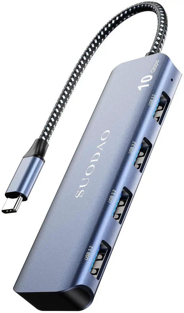 SUODAO USB 3.2 Hub can easily expand one USB C port of your computer in to four USB A ports.
