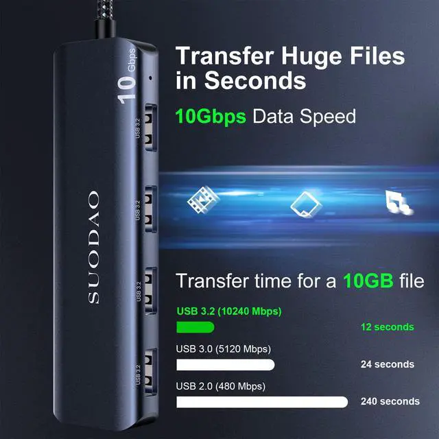 SUODAO USB 3.2 HUB adopts the newest USB standard - USB 3.2 Gen 2.Most hubs on the market adopts the USB 3.0 standard now, and the transmission speed is only 5Gbps. We use the latest USB3.2 version to provide you with a super high-speed transmission speed up to 10Gbps, twice the data transmission rate of conventional USB 3.0 in theory.Saving your transmission time and improving your work efficiency.Backward compatible with USB 3.0/2.0/1.0, supporting both legacy and new USB devices
