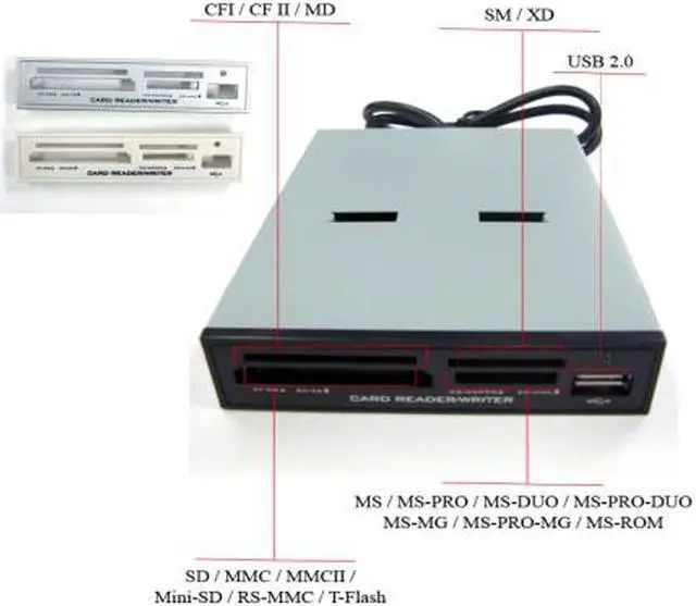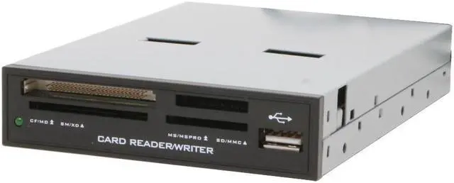 Super Talent's all-in-one card reader fits into a 3.5" drive bay on your desktop computer, and provides you an extra USB 2.0 port, right on the front. This 4-slot reader reads CF, SD, MMC, SM, and Sony MS media. Included, interchangeable black, white, and beige bezels ensure that the reader blends seamlessly into your computer case. Compatible with Windows 98SE, ME, 2000, XP, and Vista, and Mac OS 9.2 and higher. Reading your flash media has never been so convenient!