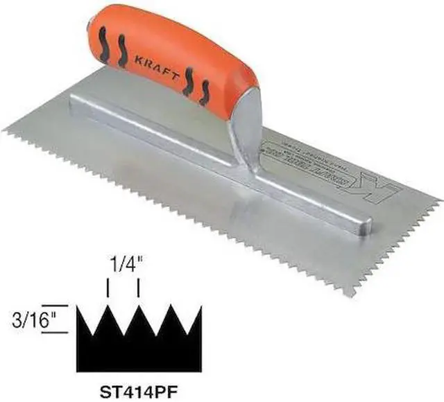 Trowel, Blade Length 11 in, Blade Material Carbon Steel, Blade Shape Square, Blade Width 4 1/2 in, Compatible Primary Material Adhesive, Mortar, Handle Length 5 in, Handle Material ProForm, Handle Style Camel Back, Notch Depth 3/16 in, Notch Shape V, Notch Spacing 3/16 in, Notch Width 1/4 in, Product Type Trowel. This item has been restricted from sale in the following state(s): []