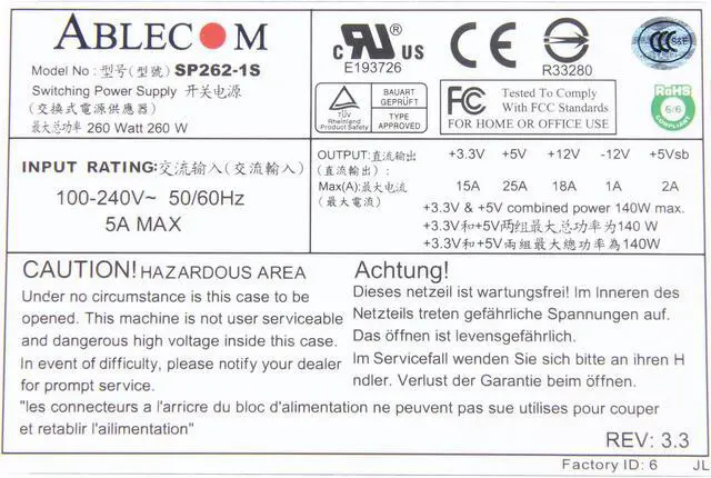 Part Number : Pws-0055Manufacturer: AcbelWattage : 260 WattType : Server Power Supply