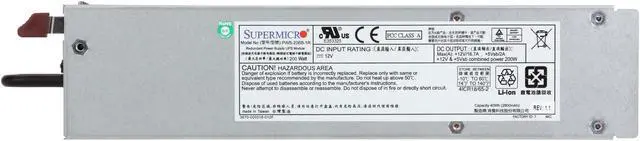 | Features | Same dimension & compatible w/ PWS-406P-1R (54.5W x 220D x 40H mm); short depth Output Voltage: 12V and 5Vsb Battery capacity: 5 min. (200W), 15 min. (100W), 6 sec. (350W Surge) Idle power consumption ~2W; charging power consumption ~20W Hot Swappable I2C/Smart battery remote management Certificates: UL, C-UL, TUV, CB, FCC |
