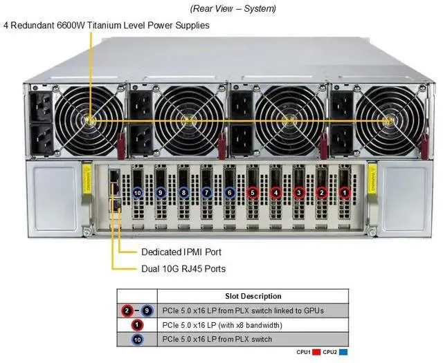 | Power Characteristics | 4x 6600W Redundant (2 + 2) Titanium Level (96%) power supplies |