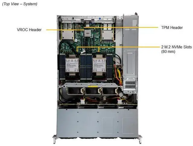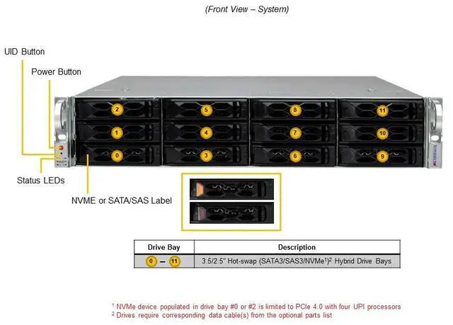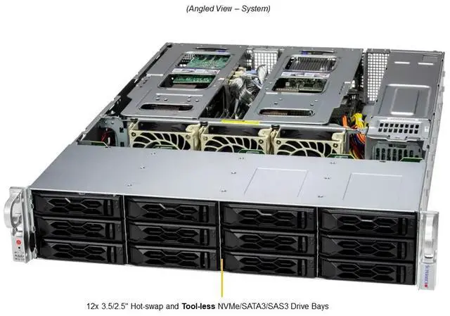 | Expansion Bays | 12 front hot-swap 3.5" NVMe*/SAS*/SATA* drive bays 2 M.2 PCIe 5.0 x4 NVMe slots (M-key 2280(default); VROC required for RAID) |