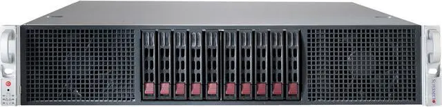 The chassis comes with 10 hot-swap 2.5" SAS 3 / SATA 3 hard drive bays. In addition to the six PCI-E 3.0 x16 slots, the motherboard offers one PCI-E 3.0 x8 (in x16) low-profile slot.