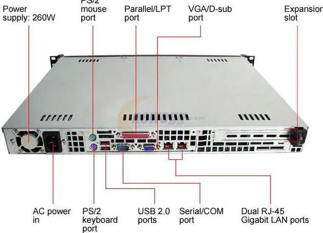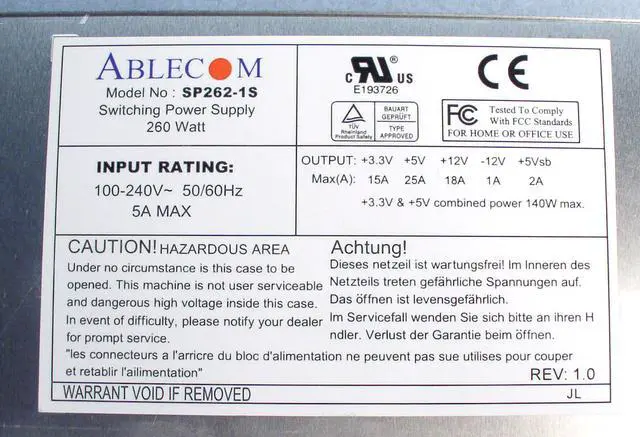• Thermal control 260W AC power supply with PFC ( 24-pin, 4-pin=12V, (2) 4-pin ) AC Voltage: 100 - 240V, 60-50Hz, 4 Amp Max DC Output: 5V + 3.3V = 140W