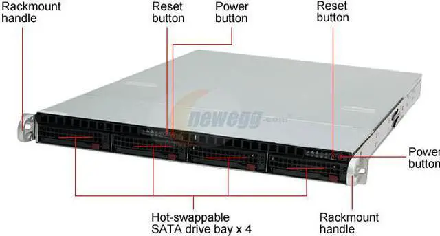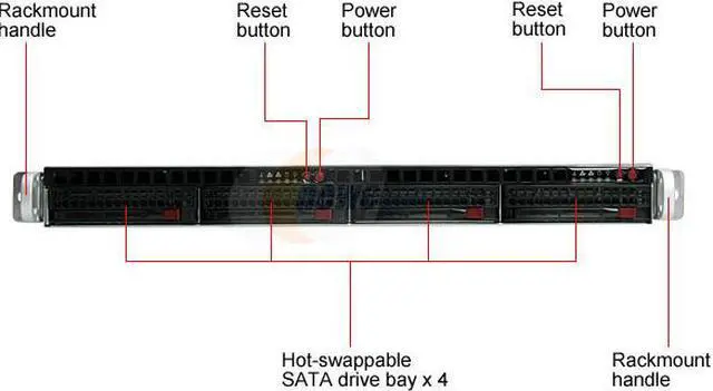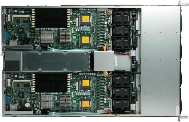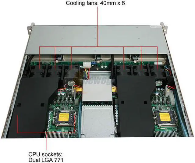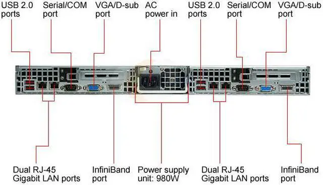 | Features | Black System Cooling : 6x Cooling Fans Two systems (nodes) in a 1U form factor. Each node supports the following: 1. Dual-processor Quad & Dual Core Intel 64-bit Xeon Support, 667 / 1066 / 1333MHz FSB 2. Up to 32GB DDR2 667 & 533 SDRAM Fully Buffered DIMM (FB-DIMM) 3. 1 (x8) PCI-Express 4. Intel (ESB2/Gilgal) 82563EB Dual-port Gigabit Ethernet Controller 5. 2x Hot-swap SATA Drive Bays 6. Infiniband MT25204 20Gbps Controller 7. 900/980W High-efficiency Power Supply Input / Output (per Node) : Serial ATA Four Serial ATA ports LAN 2x RJ45 LAN ports USB 2x USB rear ports 2x USB internal headers Total 4 USB 2.0 Compliant VGA 1x VGA Port Serial Port 1 Fast UART 16550 serial port |