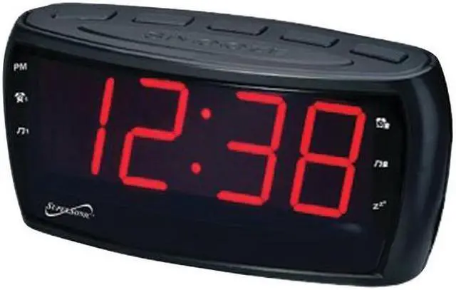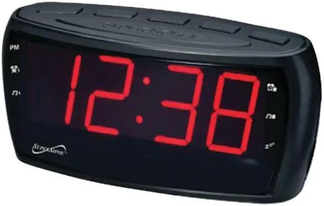 Wake up on time with the Supersonic Digital AM/FM Alarm Clock Radio with Jumbo Digital Display. It features a large 1.8 in. LED display that shows a digital clock. It also has all your favorite alarm features like a sleep and snooze timer and AM/FM radio with 20 presets.. Jumbo 1.8" LED display. Digital clock. Sleep & snooze timers. AM/FM PLL radio with 20 preset stations. Dual alarms sound to music or buzzer