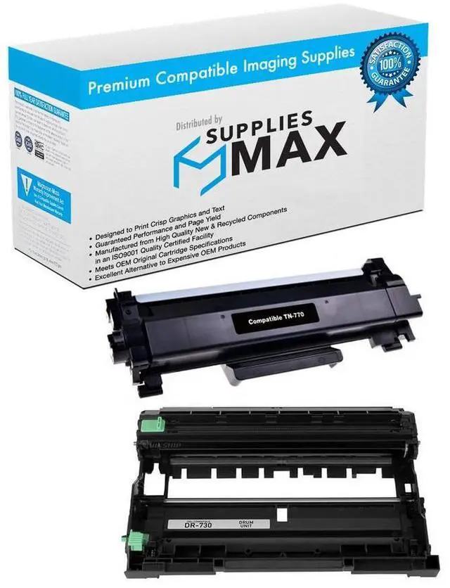 SuppliesMAX Drum Unit/Super High Yield Toner Cartridge Value Combo Pack compatible replacement for Brother TN-770/DR-730. Yields up to 12000 pages at 5% coverage for consistent, high-volume printing. Built with quality components to deliver crisp black output, clear color contrast, and reliable performance for everyday business and personal use. Designed for long-lasting results and easy installation in supported 110V printers sold in the U.S.