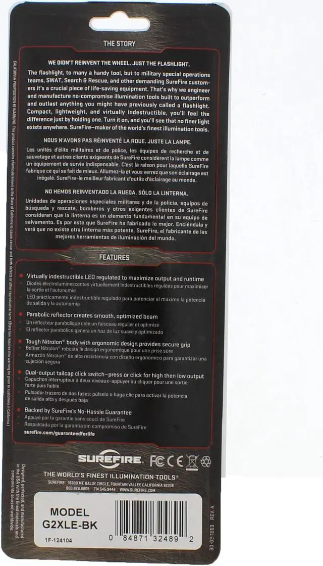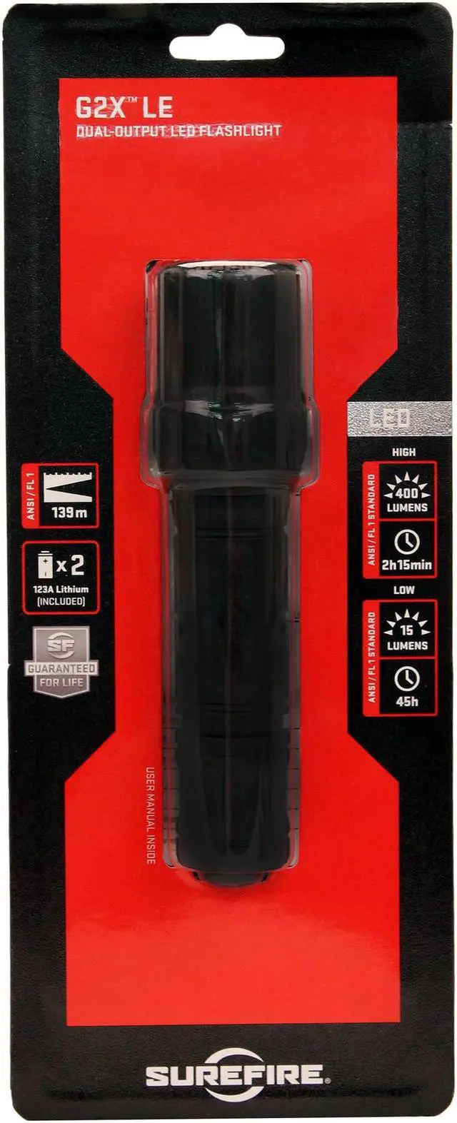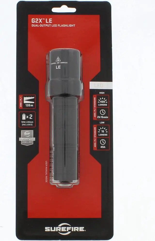 G2XLE-BKThere's always a light at the end of the tunnel. Follow the light with SureFire G2X Heavy-Duty Compact Dual-Output High-Intensity LED Flashlight. The darkness can't frighten you any longer thanks to this high-performance dual-output flashlight. With 2 output levels, you decide how much illumination you need, ranging from 15 to 600 lumens. Press the tailcap switch for momentary-on activation, apply more pressure to the button for constant-on low. For full power, return to off, then press again for maximum brightness. The parabolic reflector creates a precise and smooth optimized beam with plenty of reach so you can clearly navigate your route.