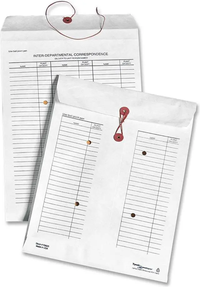 Interdepartmental envelopes expand up to 1-1/2" to accommodate more materials. Secure contents with string and button closure. Durable Tyvek resists moisture and tearing. Each envelope is preprinted on both sides with space for 54 entries. Each entry offers space for recipient name and plant or department.