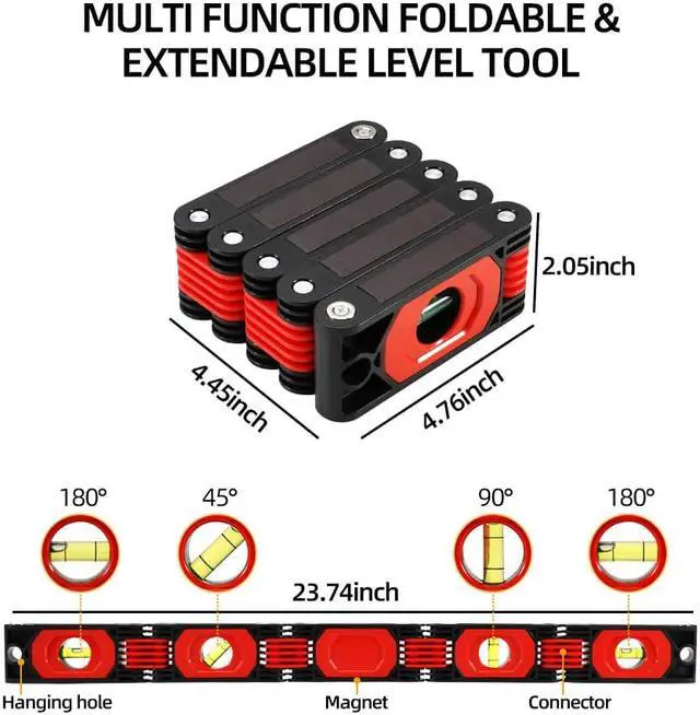 Compare with others level tool, SuSuMu multi function foldable level not only can extend straight long size to 28inch for horizontal (0-180), vertical 90 and 45 degree, but also measures precisely and quickly, even around corners, pipes, or on stairs.