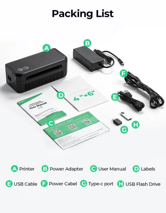SVANTTO Y42BT Bluetooth Thermal Printer is designed for small businesses and home offices, delivering high-speed printing and effortless connectivity. What's in the Box: Bluetooth Label Printer x 1 USB Cable x 1 Power Adapter x 1 4x6 Thermal Labels x 1 User Manual x 1 This versatile wireless label printer supports USB for Windows, MacOS, and ChromeOS, and Bluetooth connectivity for iOS and Android via the FlashLabel Pro app. Perfect for shipping labels, barcodes, and more, it is compatible with major platforms like Amazon, eBay, USPS, and Shopify. It handles labels from 1.57" to 4.3" in width, providing flexibility for all your labeling needs.With direct thermal printing technology, it eliminates the need for ink or toner, saving you time and money. Enjoy a fast printing speed of up to 72 labels per minute, ensuring smooth, efficient workflows for your business.Easy Setup & Use: The compact, portable design makes it ideal for tight spaces, and the included FlashLabel Pro app provides easy label design with access to thousands of templates, icons, and fonts. Whether you're printing shipping labels, barcode labels, or name tags, this thermal shipping label printer simplifies the process. This 4-inch thermal label printer is perfect for mailing, featuring strong adhesive label compatibility and easy postage label printing to improve your shipping efficiency.