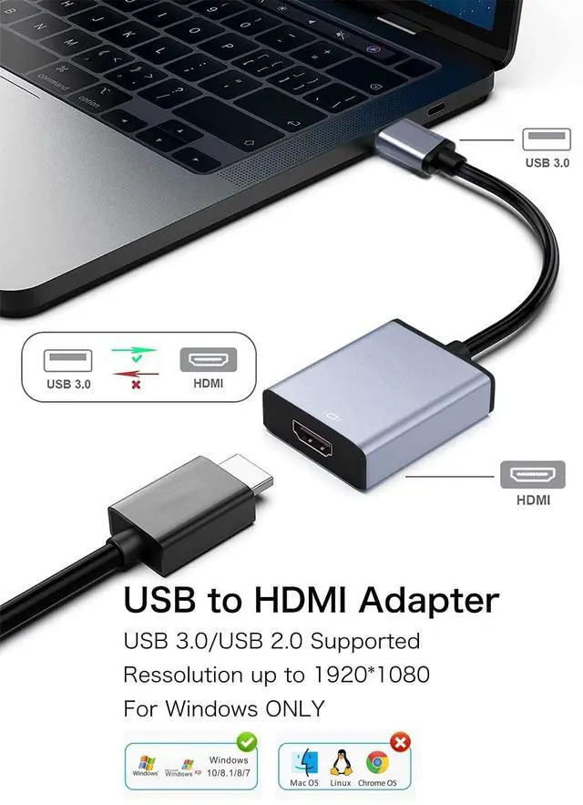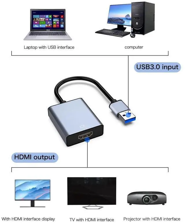 USB to HDMI Adapter: Ultra Fast USB 3.0 portand built-in with premium quality chip for stable performance and long life. It connects your computer to an HDMI-capable HDTV, monitor or projector via a USB interface, giving you smoother HD video.