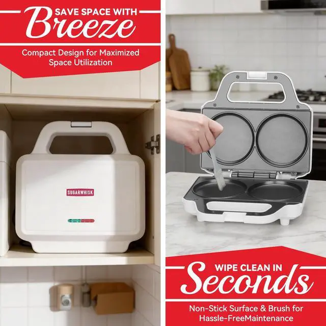 [NO MESS]: The PFOA-free, dual-sided 4 inch non stick griddle surfaces guarantee hassle-free cleaning without creating any mess. The Brush & Scraper provided will also assist you in effortlessly removing food remnants from the cooking griddles.