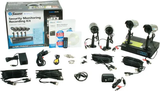 | Features | Ideal security technology for 24/7 peace of mind for your business and home Monitor, record and view 4 day/night, indoor/outdoor cameras simultaneously without any security "blind spots" Motion detection mode only records activity, saving hard drive space without recording hours of "dead" footage Ultra-compact design size with small footprint that easily fits any desk, work space or retail counter Automatic night vision captures good image clarity up to 30ft (9m) away Easily connects to your TV with ability to easily transfer video to flash drive Professional security solution at a fraction of the price with no ongoing monthly fees |