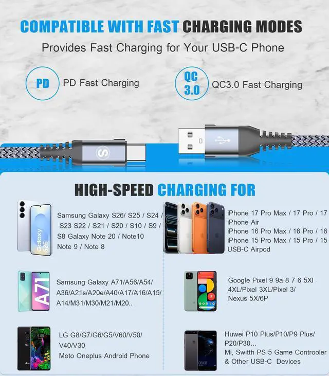 ![Alt view image 2 of 7 - USB Type C iPhone 16 Pro Max Charger Cable [2-Pack,6.6ft+6.6ft] Nylon Braided USB C Cord for iPhone 16 15 Pro Max Samsung Galaxy S25 S24 S23 S22 S21 S20 S10 A54 A53 A52 A15 Pixel 9 8 LG Moto](https://c1.neweggimages.com/productimage/nb640/C5RZD2603310YC62XB8.jpg)