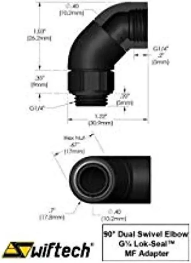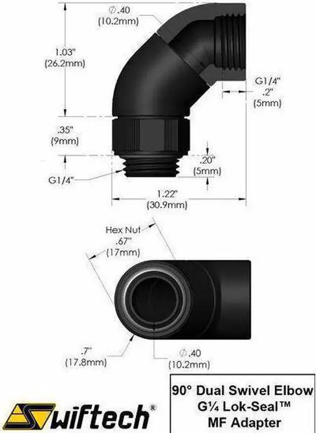 The Swiftech Lok-Seal? Compression Fitting G1/4 Thread - 3/8" ID x 1/2" OD is a compression fitting used for tubing with 3/8" inner diameter and 1/2" outside diameter. Both base and a second swivel located at mid fitting rotate 360? for optimum tubing orientation; the female thread allows installation of a compression fitting to make a 90? Dual Swivel elbow fitting. G?" Male And Female Threads 360? Dual Swivel With Hi-Flow 10.2 mm Bore