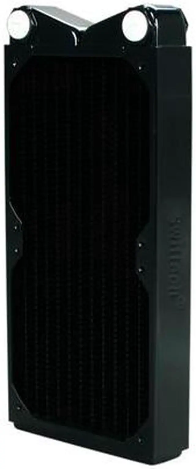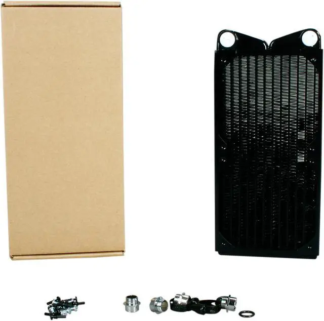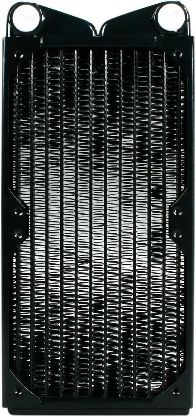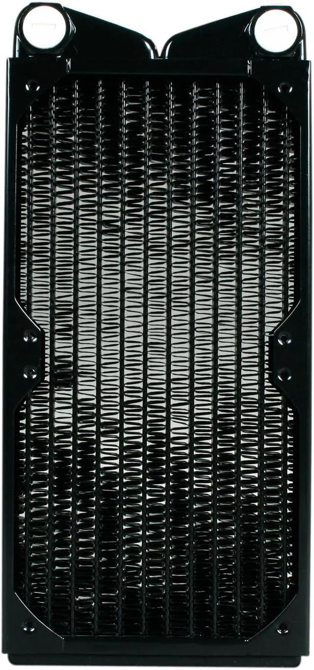 | Features | 2-pass, single row construction Brass body and tubes, louvered copper fins Optimized fin-density for maximum heat dissipation at low noise Self-purging brass plenum chamber M3.5 threaded fan and case-mounting holes Slim form factor 11.2 x 5 x 1.3" (284 x 128 x 34mm) 1/4" NPSM threaded hubs High-durability acrylic paint finish ROHS compliant Vertical (inlet/outlet at top) : yes Vertical (upside-down): possible, but not recommended due to accumulation of air over time; we recommend using the MCR220-Res instead On the side: yes Horizontal (either face): yes |